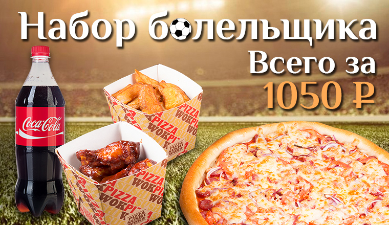 Вкусная пицца «Футбольная», сочные крылышки «Буффало», картофель по-деревенски и Кока-Кола.
